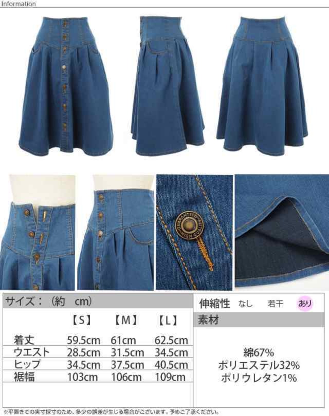 着丈:62.5cm、ウエスト:34.5cm、ヒップ:40.5、裾幅:109cm